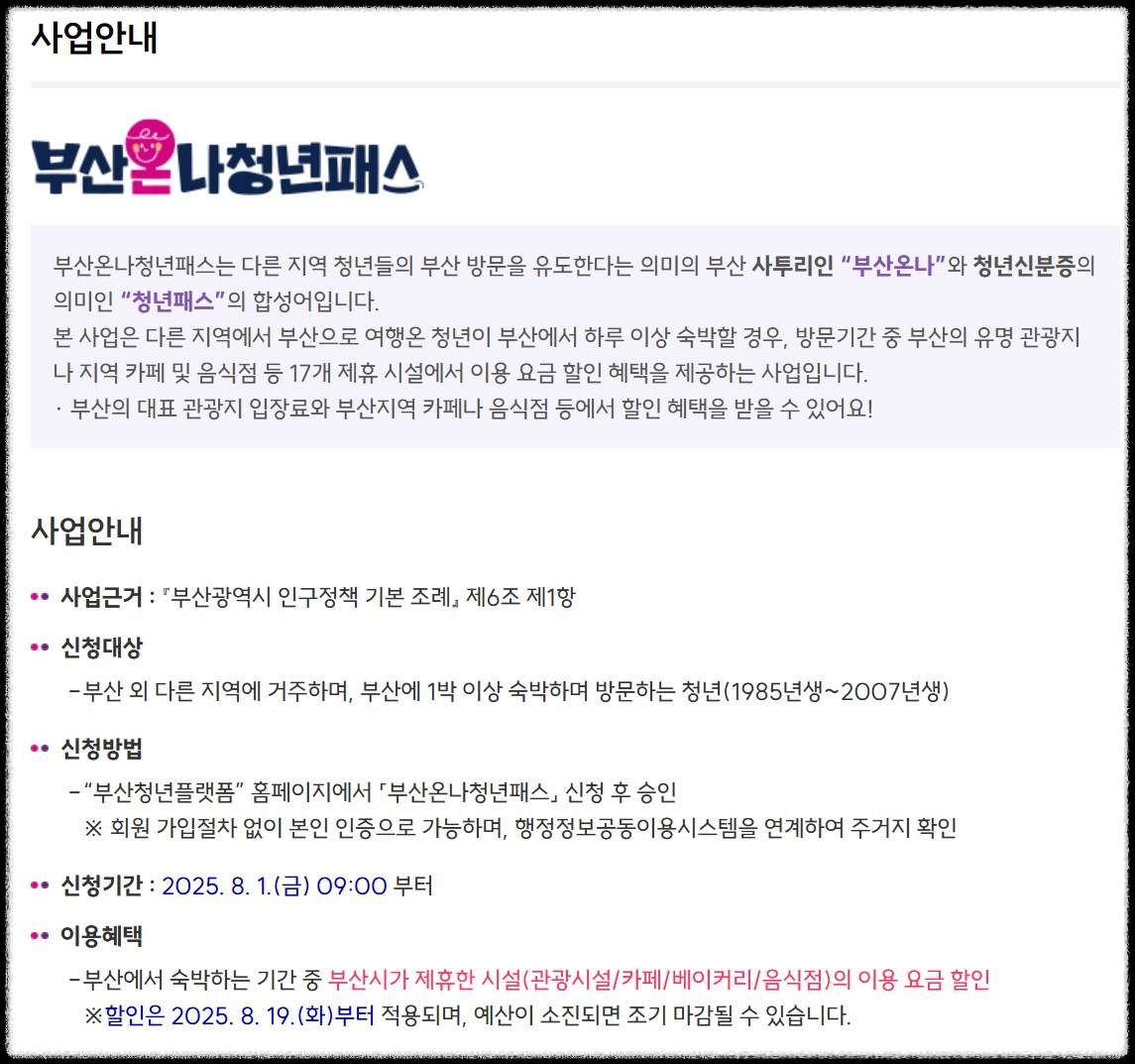 부산온나청년패스는 부산을 방문하는 청년들에게 다양한 할인 혜택을 제공하는 프로그램이에요. 이 패스는 부산 외 지역에 거주하는 만 18세에서 39세의 청년들이 신청할 수 있으며, 부산에서 1박 이상 숙박할 경우에만 유효하답니다. 패스를 통해 부산의 다양한 관광지와 음식점에서 할인 혜택을 받을 수 있어요.