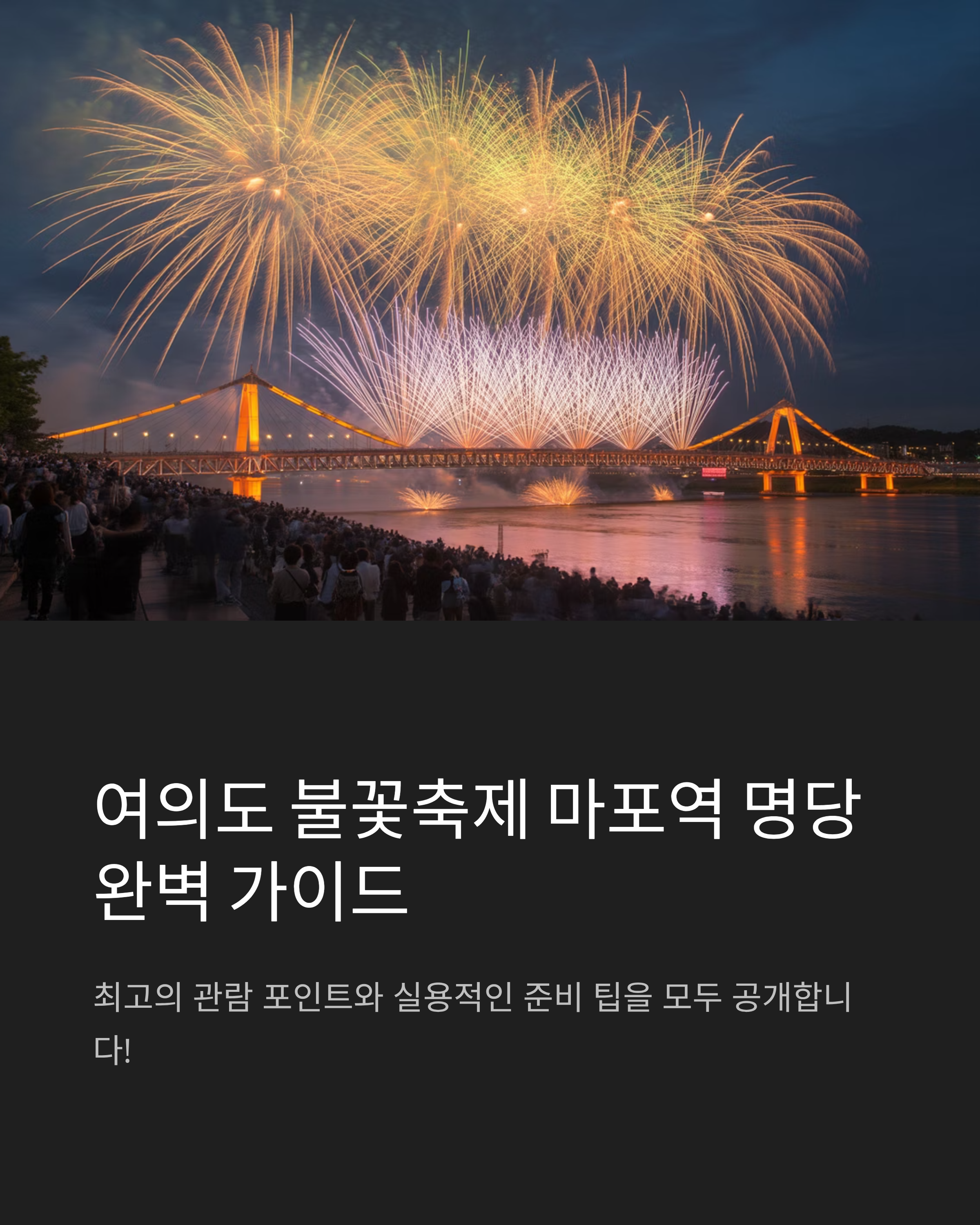 여의도 불꽃축제는 매년 많은 사람들에게 즐거움을 주는 행사입니다. 마포역 근처의 명당을 활용하여 최고의 관람 경험을 누리시길 바랍니다. 미리 준비하고, 안전하게 관람하여 소중한 추억을 만들어보세요.