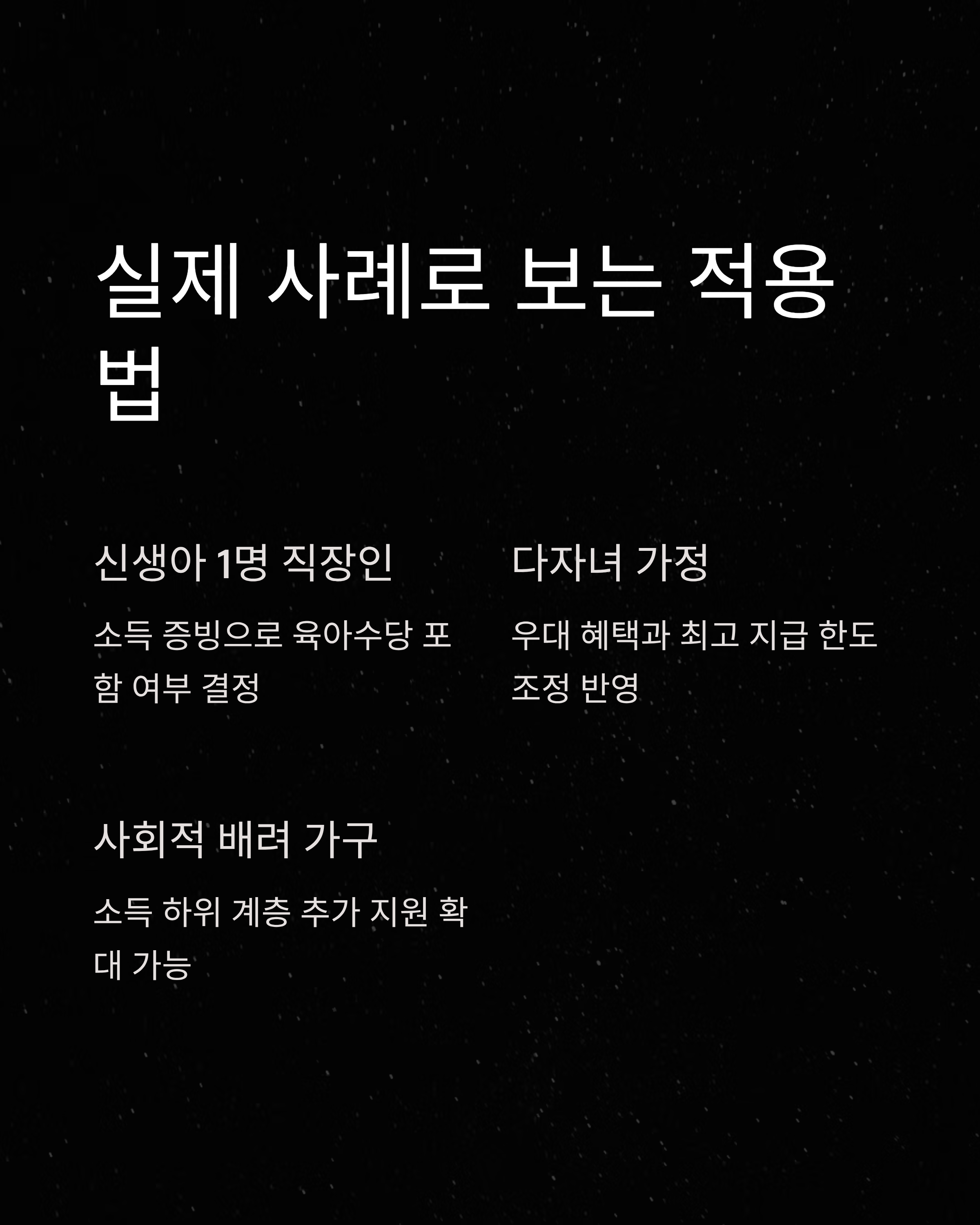 - 변화 포인트: 소득 기준에 따라 육아수당 포함 여부가 달라질 수 있어 가족 소득 증빙이 중요합니다.