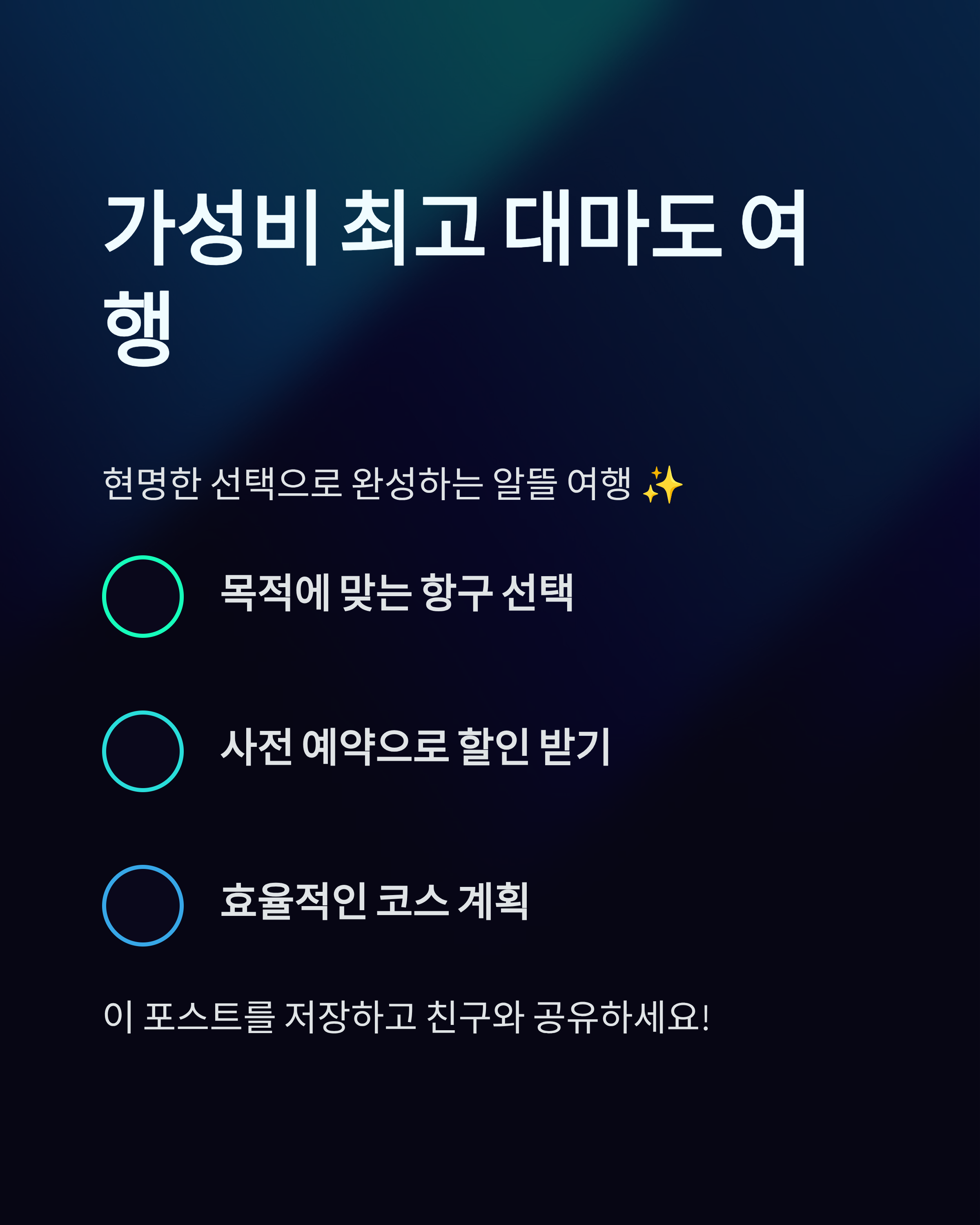 * 숙박비 절약: 당일치기 여행이므로 숙박비는 발생하지 않지만, 만약 1박 2일 여행을 계획한다면, 게스트하우스나 민박을 이용하는 것이 좋습니다. 대마도에는 저렴하고 깨끗한 게스트하우스와 민박이 많이 있습니다.