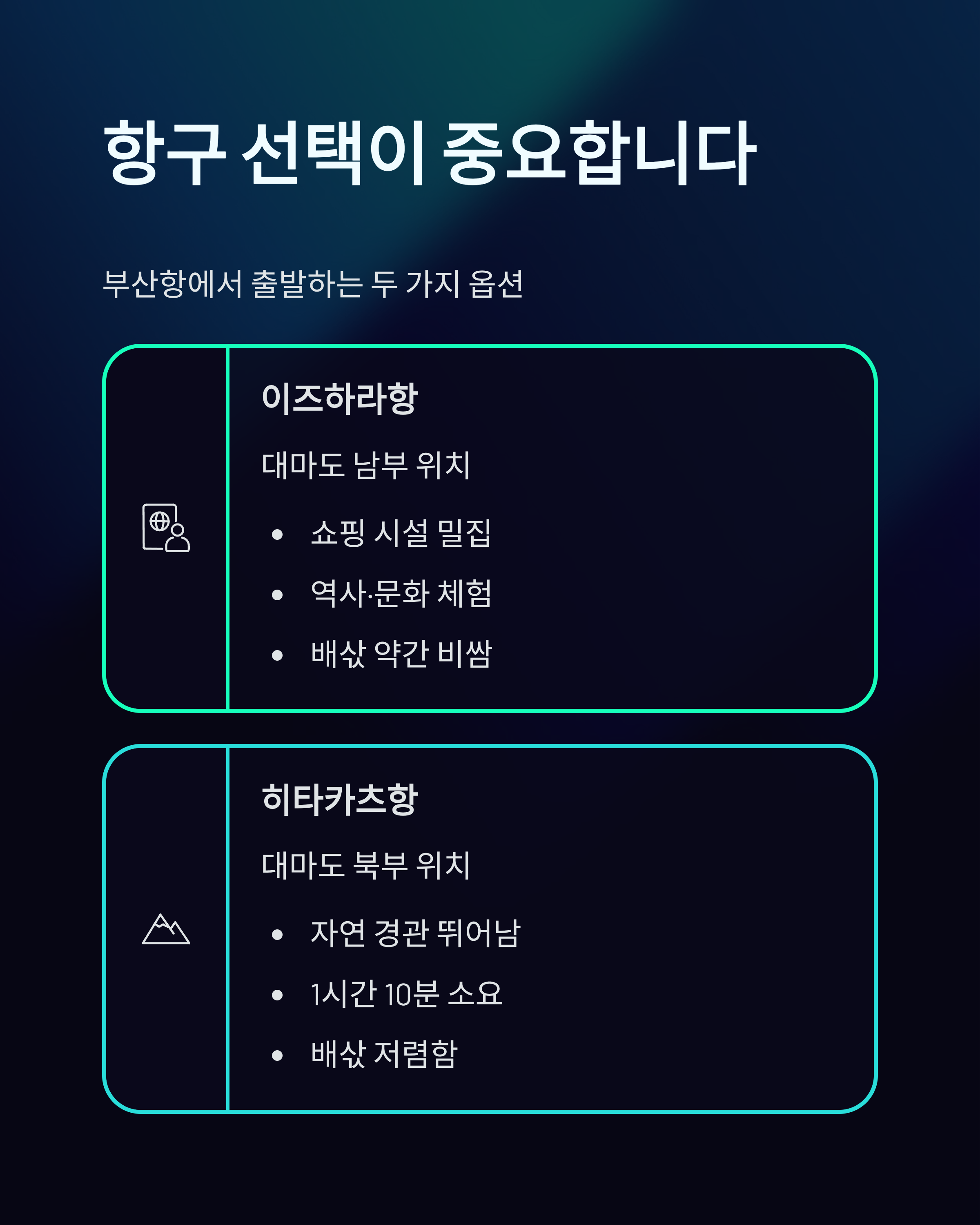 대마도행 페리는 부산항 국제여객터미널에서 출발하여 이즈하라항과 히타카츠항, 두 곳으로 향합니다. 이 두 항구는 각기 다른 매력을 지니고 있으며, 여행 목적과 일정에 따라 선택이 달라집니다.